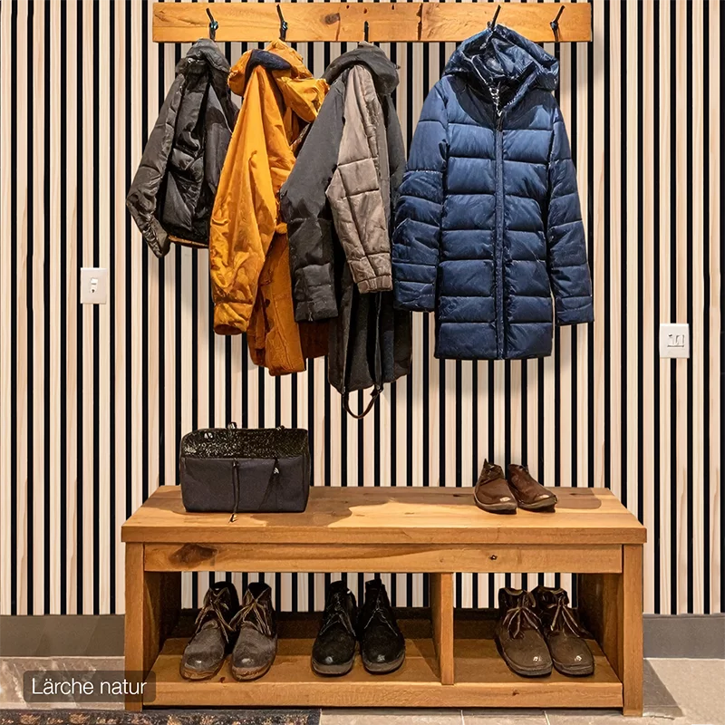 Material: Massivholz-Lamellen aus regionaler Lärche (6 mm), schwarz hinterlegt mit 3 mm Akustikvlies