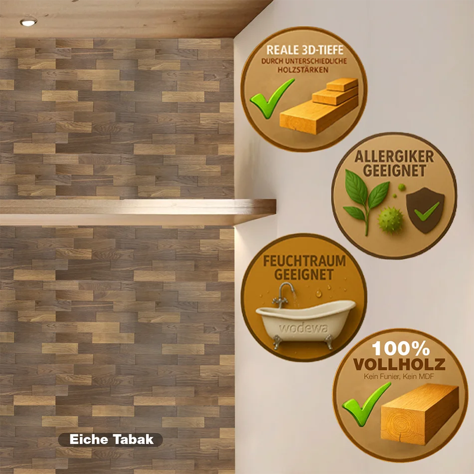 - einzigartige 3D-Optik mit massiven Holzriemchen