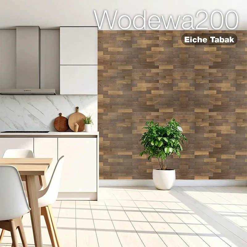 Die Eiche tabak Echtholz Wandverkleidung von wodewa wird aus deutscher Eiche hergestellt. Alle positiven Merkmale der Holzart Eiche (Maserung, Struktur) werden genutzt, um mit der Eiche tabak unseren Kunden eine hochwertige und moderne Variante für die Gestaltung moderner und eleganter Wände zu geben. Zusätzlich bietet Sie eine interessante einheimische Alternative zu den dunkelfarbigen tropischen Holzarten. Mit der ausdrucksstarken Struktur bleibt die Holzart Eiche erkennbar und verleiht dadurch der wodewa Echtholzwand die gewohnte Natürlichkeit. Der dunkle Farbton wirkt exklusiv und schön. Somit fühlt sich diese Eichenvariante in allen modernen Einrichtungen und Räumen zu Hause.